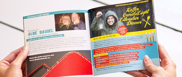 5 mal im Jahr kommt ein neues Programmheft für die Kofferfabrik heraus. Und jedes mal wird es schon sehnsüchtig erwartet. Natürlich – denn es bietet die komplette Übersicht für die nächsten Monate. Von Konzerten über Theaterveranstaltungen bis hin zu den wechselnden Themenbrunches.